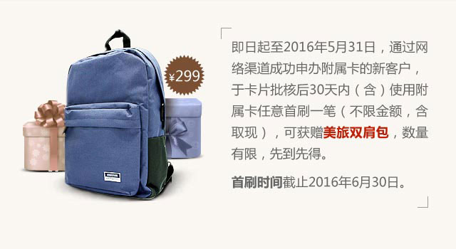 - 1即日起至2016年5月31日,通过网络渠道成功申办附属卡的新客户,于卡片批核后30天内(含)使用附属卡任意首刷一笔(不限金额,含取现),可获赠美旅双肩包,数量18000个,先到先得。首刷时间截止2016年6月30日。