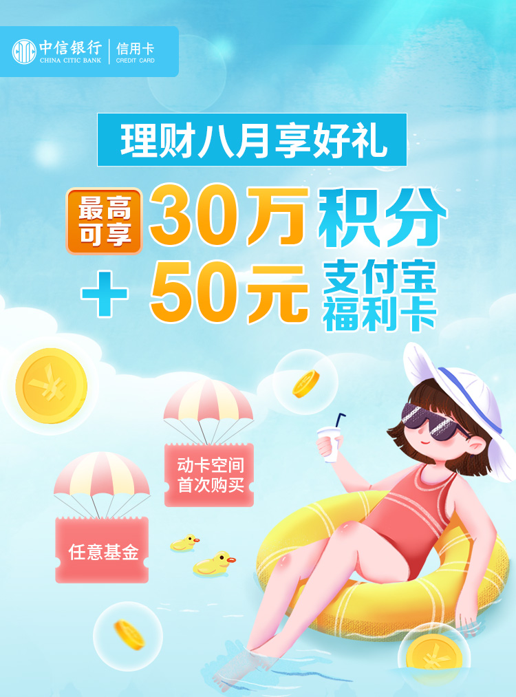 中信银行借记卡新客户的借记账户月日均资产达到1元/1000元/10000元,对应发放10元/20元/50元支付宝福利卡。1元支付宝福利卡可抵扣1元。
