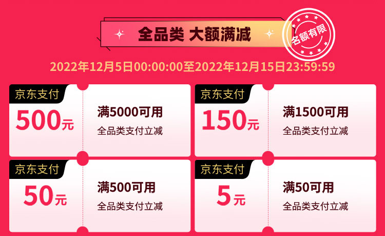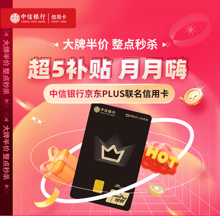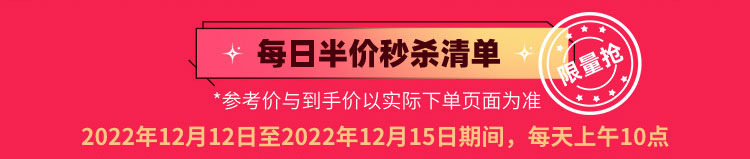 2022年12月12日至2022年12月15日期间,每天上午10点选择京东支付并使用本人名下中信银行京东PLUS联名信用卡下单下列商品,即有机会享受订单实付金额半价立减,优惠名额有限,先到先得。优惠名额于活动期间每日10:00:00更新。活动期间同一持卡人优惠仅限享受1次。