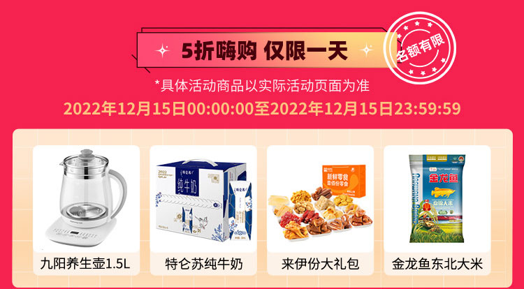 5、【5折购专区】中的商品清单视活动页面的商品名和首跳链接为准,如选择链接内其他类别和规格的商品则无法享受5折优惠。
