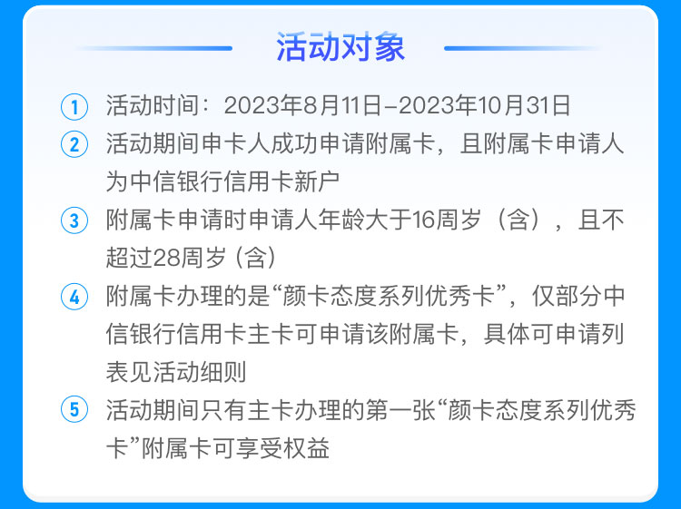 1. 活动期间申卡人成功申请附属卡,且附属卡申请人为中信银行信用卡新户