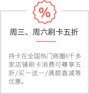 2017年8月2日--2017年12月31日期间逢周三、周六,持中信银行信用卡在全国指定门店刷卡消费指定金额/产品,即可尊享五折/买一送一/ 满额直减等优惠,还有众多区域商场优选餐饮商户精彩礼遇邀您共享!