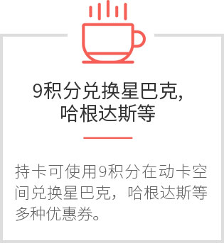 活动简介:中信银行信用卡指定客户每自然月在餐饮娱乐类、百货超市类、商旅类指定商户消费或微信、支付宝交易满足条件,通过以下方式可获得9分享兑权益。凭此权益只需9积分,即可兑换星巴克咖啡、哈根达斯冰淇淋等超值优惠!