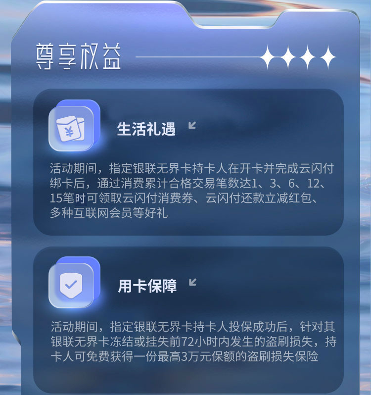 1.用户可通过“银联卡官方服务号”微信公众号-“热卡推荐”-“无界卡”-“数字生活礼遇”或“云闪付APP首页”-“权益精选”-“无界卡权益”-“数字生活礼遇”或“中国银联95516”微信公众号-“活动权益”-“银联卡礼遇”-“无界卡权益”-“数字生活礼遇”进入活动页面,选择并绑定一张本人名下的无界信用卡完成报名。