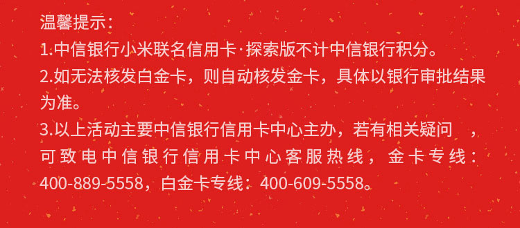 活动对象:活动期间内成功办理中信银行小米联名信用卡·探索版的新客户(除小米渠道)。