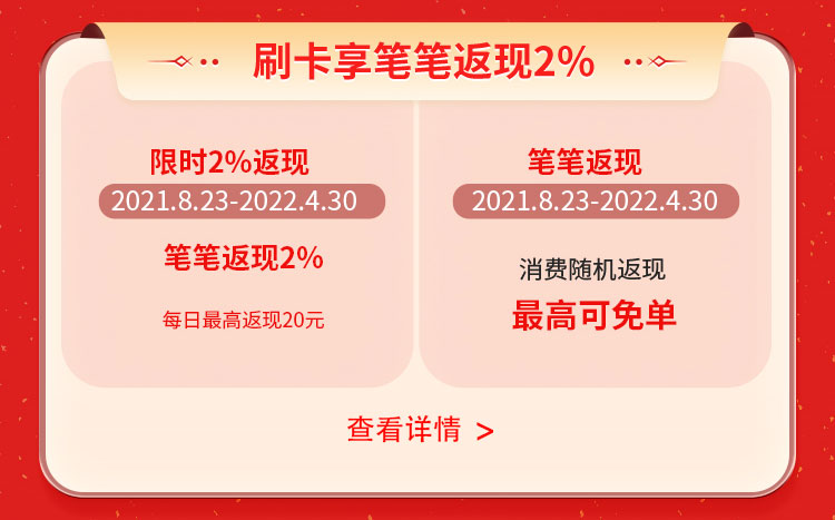 2021年8月23日-2022年2月28日(包含活动一开展周期),中信银行小米联名信用卡·探索版用户使用支付宝和官方指定平台支付,享笔笔随机返现(单笔消费金额需大于等于1元),最高可免单。随机返现每自然日、每自然月没有返现封顶限额。