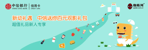 2016年8月19日至2016年12月31日,通过本页面申办中信信用卡的新客户,且在核卡60天内完成首刷的,可在首刷后60天内获赠蜘蛛网价值百元观影大礼包一份,内含电影票、抽奖券、电子杂志阅读卡。