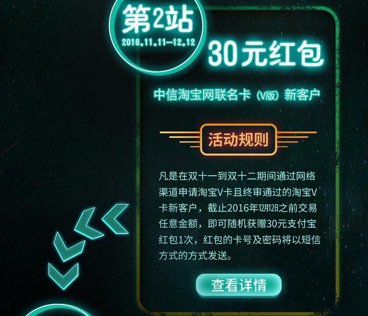 2016.11.11--2016.12.12(含),成功申请淘宝V卡且终审通过的新客户,截止2016年12月12日之前交易任意金额,即可随机获赠30元支付宝红包1次,红包的卡号及密码将以短信方式发送。