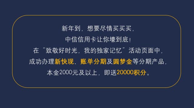7.成功办理分期产品获得积分奖励的客户名单将在活动结束后一个月内通过中信信用卡官网发布,敬请留意。