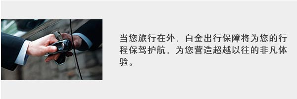 为您提供国际组织(VISA、MasterCard、Unionpay)一流的礼宾服务。需要查寻珍版书籍、聘请爵士乐队或安排豪华游轮,白金礼宾服务全力为您安排。亲切,细致的娱乐和旅游生活,由白金礼宾服务带给您。