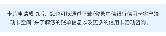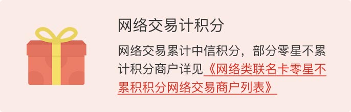 3、中信银行信用卡中心不是礼品(服务)的实际生产商或供应商,若礼品(服务)出现质量问题,或因礼品(服务)缺陷造成人身伤害或财产损失的,客户应直接与生产商或供货商交涉,中信银行将为持卡人提供必要协助。