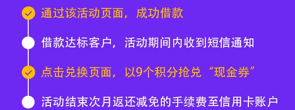 现金券用于冲减办理新快现产生的现金分期手续费,如已收到借款达标的短信通知,可点击短信中链接抢兑“现金券”或于活动页面抢兑;