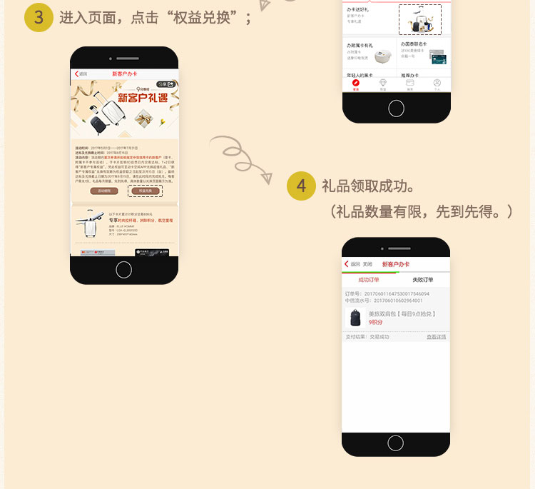 活动内容:活动期内首次申请并批核指定中信信用卡的新客户(普卡、附属卡不参与活动),于卡片批核60自然日内交易达标,T+2日获得“新客户专属权益”,可用于兑换超值好礼,“新客户专属权益”兑换有效期为权益获取之日起至次月15日(含)。最终达标及兑换截止日期为2017年8月15日,请在此时段内完成抢兑。每客户限兑1份。礼品每月限量,先到先得,具体兑换数量以兑换页面展示为准。 即日起至7月31日为申请且批核时间。