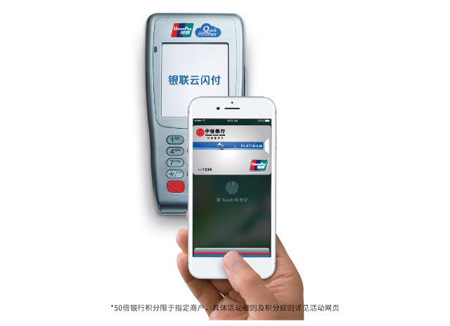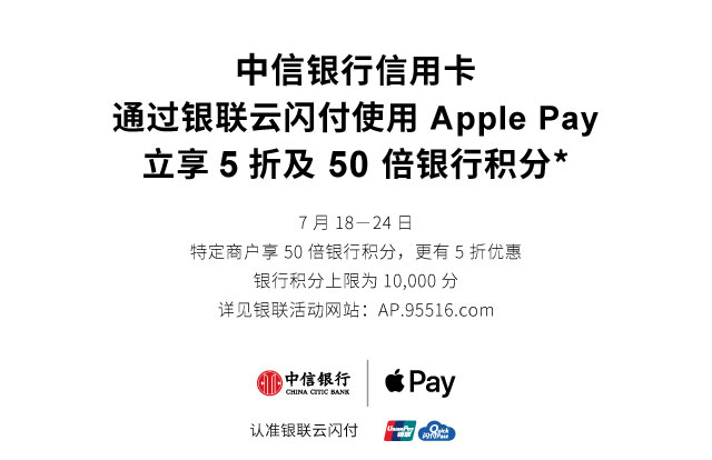 活动内容:活动期间,中信银行信用卡通过银联云闪付使用Apple Pay在指定活动商户消费立享5折及50倍积分,每位用户累计可赠送中信信用卡积分上限为10000分,数量有限先到先得。