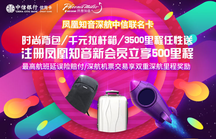 首次申请并批核凤凰知音深航中信银行联名卡的新客户(普卡、附属卡不参与活动),于卡片批核60天内交易达标,T+2日获得“新客户专属权益”,凭此权益可至动卡空间APP兑换超值礼品,“新客户专属权益”兑换有效期为权益获取之日起至次月15日(含)。最终达标及兑换截止日期为2018年1月15日,请在此时段内完成抢兑。每客户限兑1份,礼品每月限量,先到先得,具体数量以兑换页面展示为准。