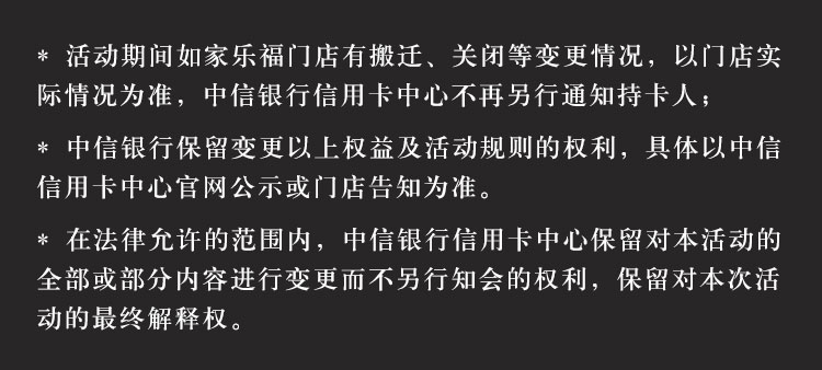 11、活动期间如家乐福门店有搬迁、关闭等变更情况,以门店实际情况为准,中信银行信用卡中心不再另行通知持卡人。