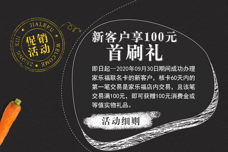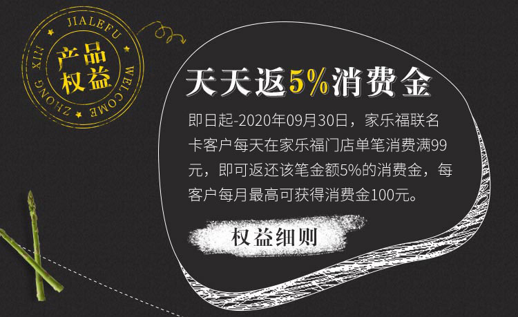 2、消费金将于新客户满足活动条件后T+3日返到客户家乐福会员账户中,T+4日起可使用。消费金仅限在全国家乐福门店内使用,有效期至次月底,到期后自动清零。