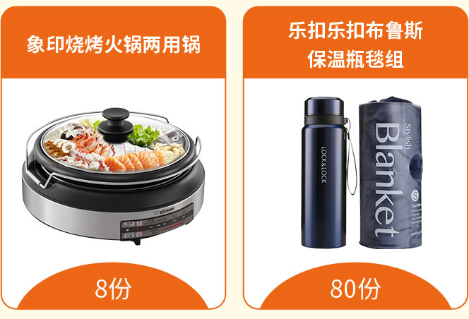 - 5各档次奖励按随机概率发放,非百分百中奖,总奖励名额:1,000积分50,000份, 30元话费充值(三网通)800份, 乐扣乐扣布鲁斯保温瓶毯组80份, 象印烧烤火锅两用锅8份。