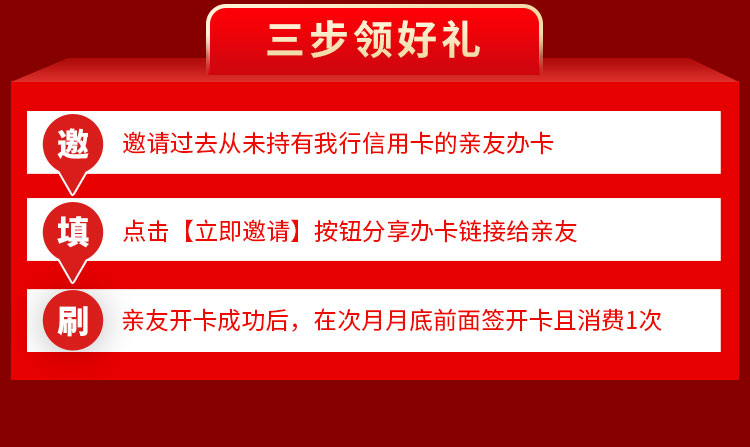 (2)受邀人申请完成后,次月月底前刷卡消费1次(刷卡、网络交易、取现均可)。
