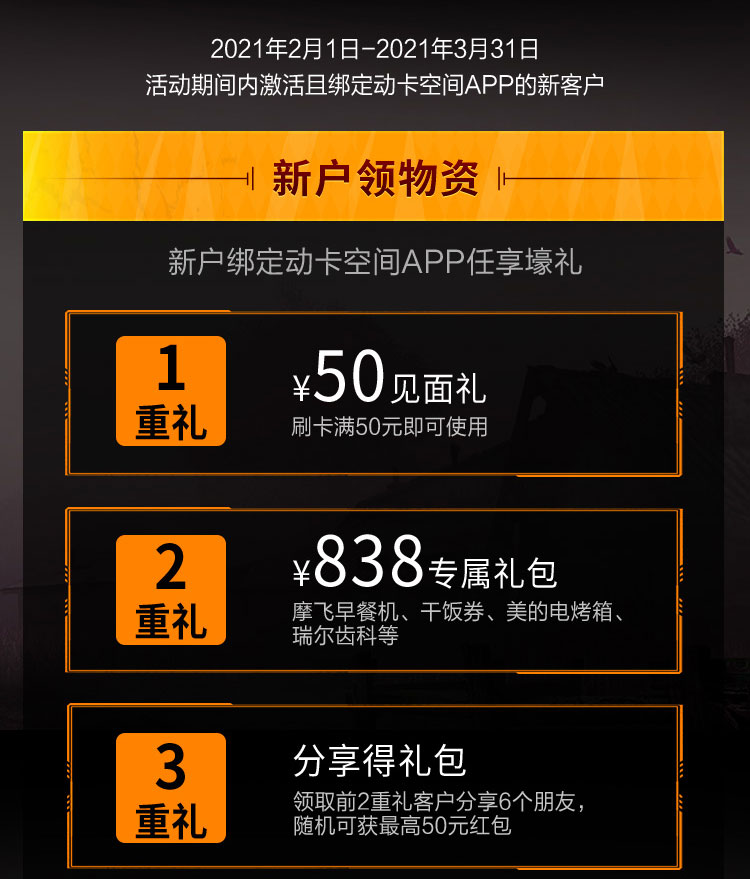 活动期间内激活且绑定动卡空间APP的新客户,可获得888元大礼包一份,大礼包内含:50元奖励金1份和新户礼商品4份,每位新客户限领1次大礼包。卡片批核后请在30天内及时兑换礼品,过期无法兑换。