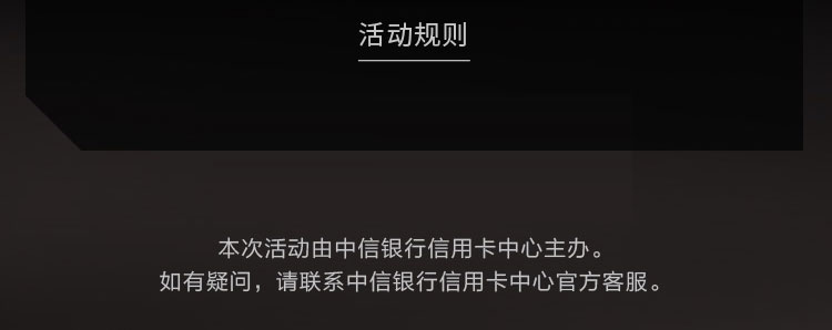 7.未成功收到商品的持卡人最晚可于当期活动结束后1个月内致电中信银行信用卡客服提出异议,未在此期间来电提出异议的,视同持卡人主动放弃所获商品。