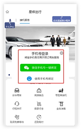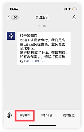 1、关注公众号【星徽出行】        尊享用车 2、绑定手机号