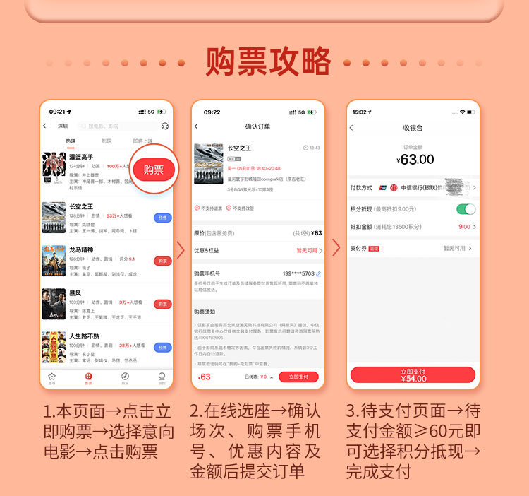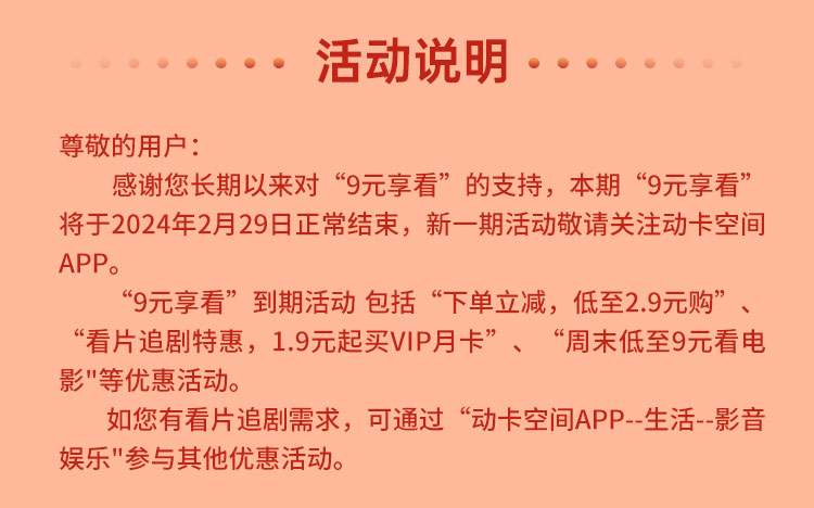 1、第四期活动开展期间,通过“动卡空间APP-生活-影音娱乐-影票”购买电影票,提交订单后实际待支付金额≥60元,可使用积分抵现最高9元(积分抵现比例:1500积分抵1元),每用户每月限享1次。