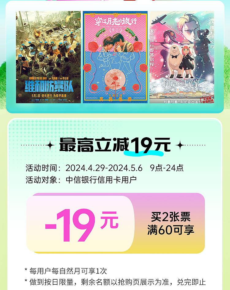 2024年4月29日-2024年5月6日,每天9点-24点,用户通过动卡空间APP购买电影票,可享1次买2张票减19元(订单金额满60元可享)的优惠,活动开展期间,每用户每月限享1次。