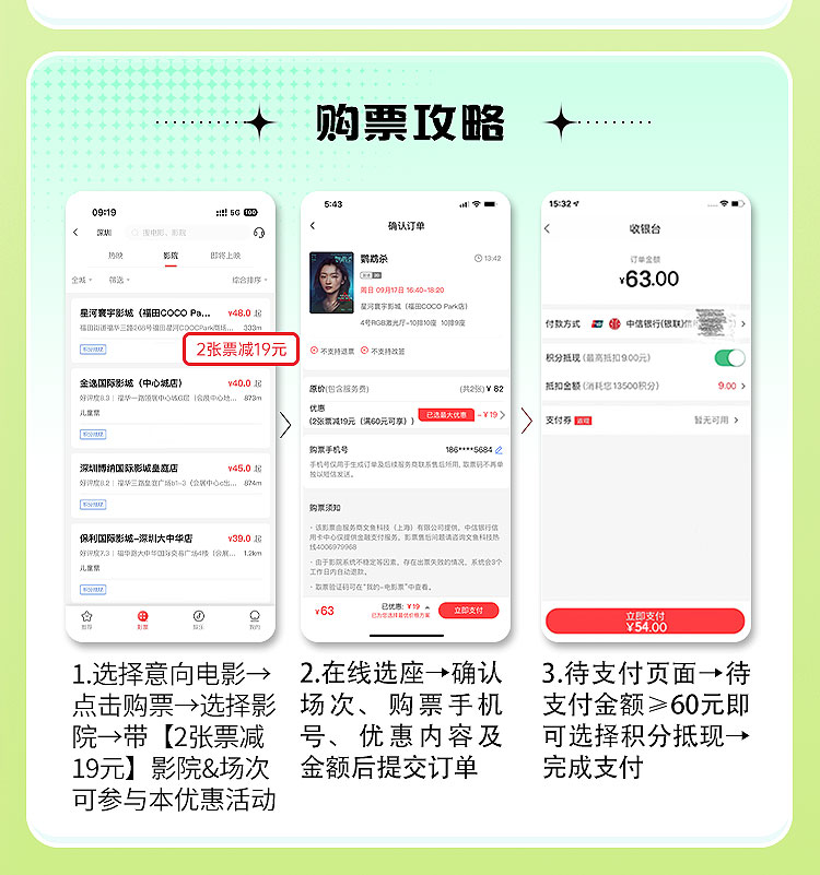 (5)参与电影票购买视为授权提供手机号,用于“生成验证码/二维码、商户提供售后服务、因活动原因联系用户”使用。为“避免生成订单失败、需商户联系协助售后处理时”,请务必于支付前确认手机号正确。