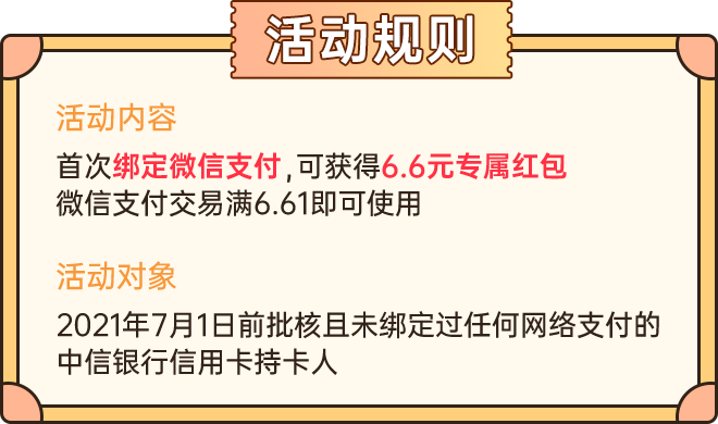 活动对象:在2021年7月1日前批核且未绑定过任何网络支付的中信信用卡持卡人