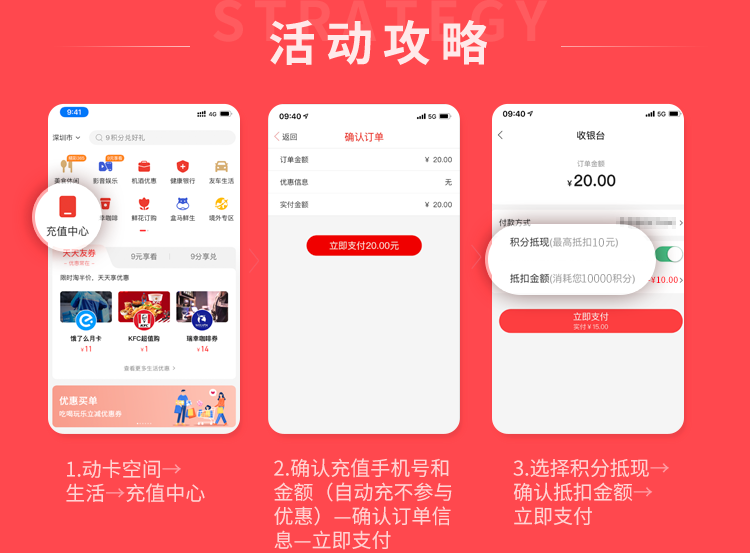 活动期间,至“动卡空间APP-生活-充值中心”充值话费,即可享受积分抵现优惠(不包含自动充值),1000积分抵1元,10积分起兑,最多抵扣比例为订单金额的30%。