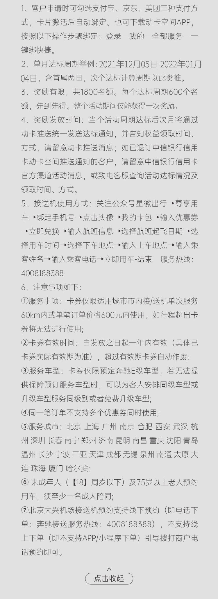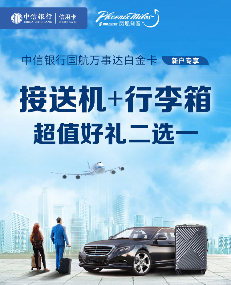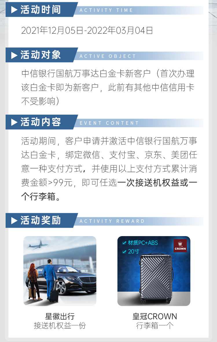 活动期间,客户申请并激活中信银行国航万事达白金卡,绑定微信、支付宝、京东、美团任意一种支付方式,并使用以上支付方式累计消费金额>99元,即可任选一次接送机权益或一个行李箱。