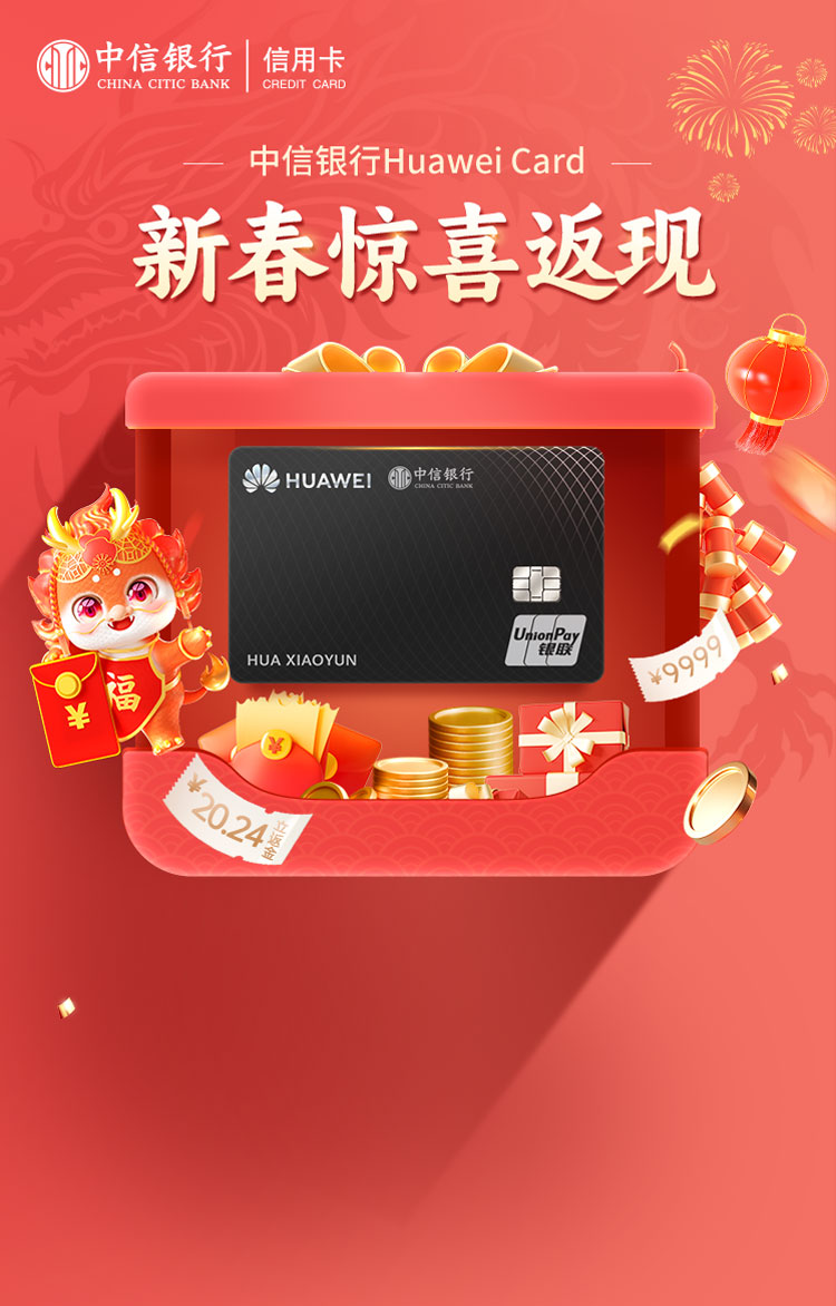 活动规则:中信银行Huawei Card客户通过Huawei Pay/华为支付/微信/支付宝/云闪付App/动卡空间App(仅限二维码支付)进行消费,单笔消费金额≥200元,立返20.24元,每日中奖名额限1000个,先到先得。活动期间每人限中奖1次。