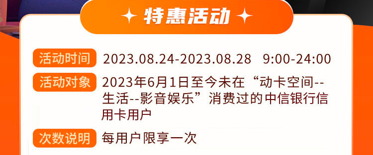 1、2023年6月1日至今,未在“动卡空间--生活--影音娱乐”消费过的中信银行信用卡持卡人。
