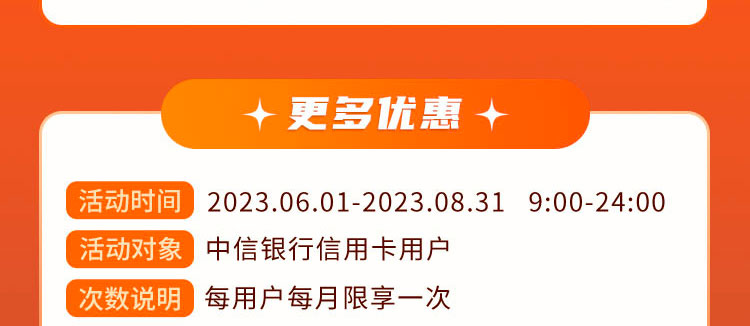 5、本活动优惠禁止进行转卖销售,一旦核实存在此类情况,中信银行信用卡中心有权取消违规持卡人的优惠资格,由此引起的任何纠纷,中信银行信用卡中心不承担任何损失与责任;