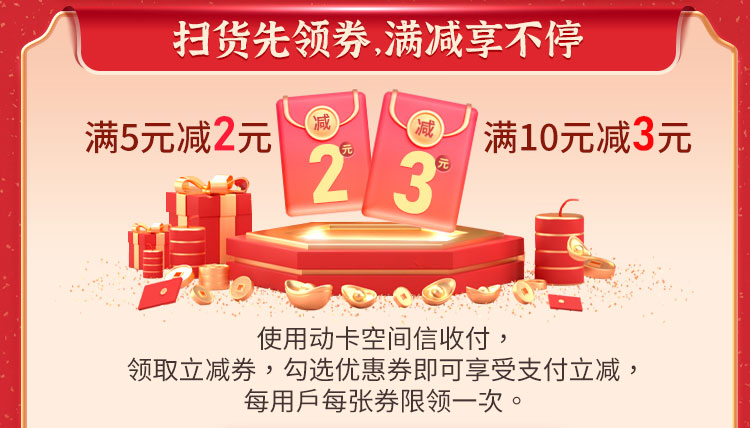 2023年1月1日9:30至2023年2月5日期间,用户可至动卡空间APP-信收付-领券中心领取满5元减2元立减券,单用户活动期间限领1张,领取后7天内有效(含领券当日)。总共发券45万张,数量有限,抢完即止。