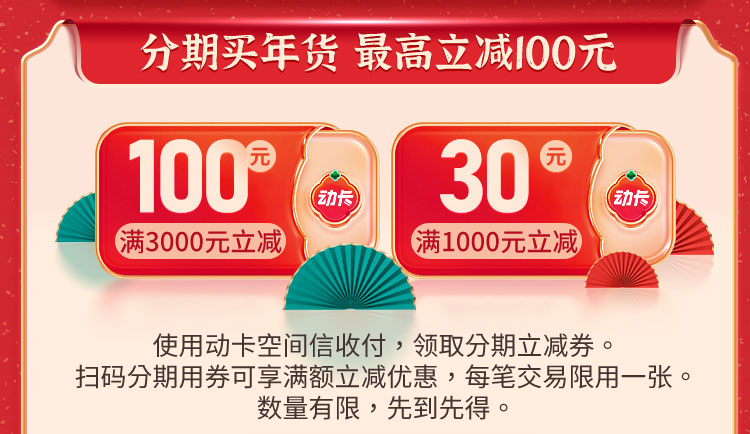 活动期间通过动卡空间9.0.6及以上版本--信收付--付款码下方领券中心界面可分别领取一张30元分期立减劵(满1000元减30元)和一张100元分期立减劵(满3000元减100元),领取成功后有效期至次日23:59:59,可在标有银联或云闪付标识的商户通过动卡空间---信收付---打开“分期支付”开关---选择期数---点击“支付劵”勾选优惠券使用。单笔订单分期金额达到活动门槛的客户即可核销相应的分期立减劵。