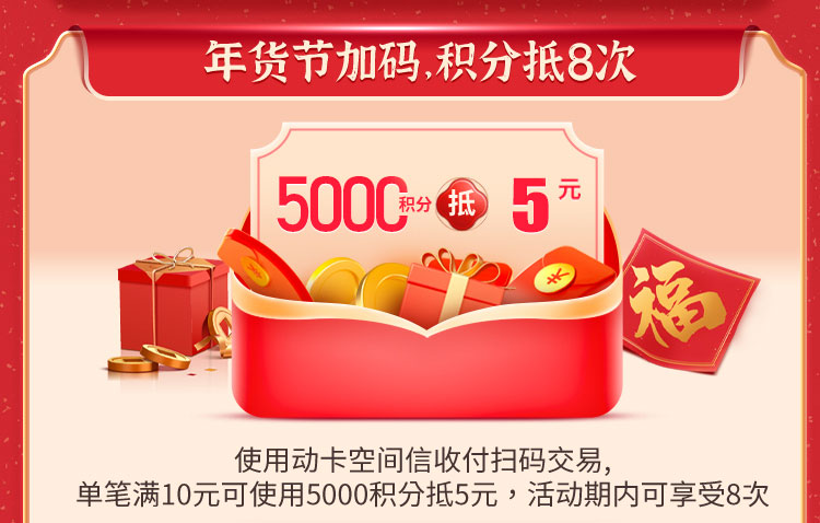 3、活动内容:使用动卡空间信收付进行二维码支付,可享积分立减权益,可使用5000积分抵5元,支付金额满10元即可使用,单用户活动期间内至多可兑换8次权益。活动期间内积分立减权益共计48万份,兑换次数有限,先到先得。