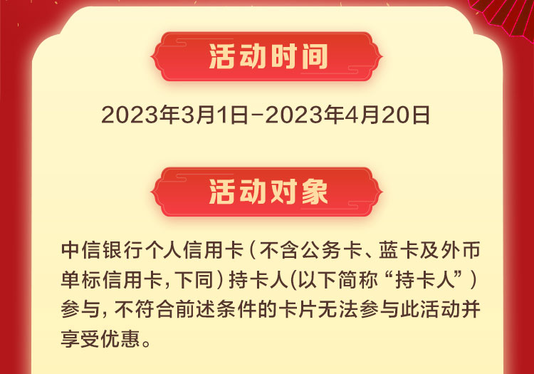 二、活动对象:中信银行个人信用卡(不含公务卡、蓝卡及外币单标信用卡,下同)持卡人(以下简称“持卡人”)参与,不符合前述条件的卡片无法参与此活动并享受优惠。