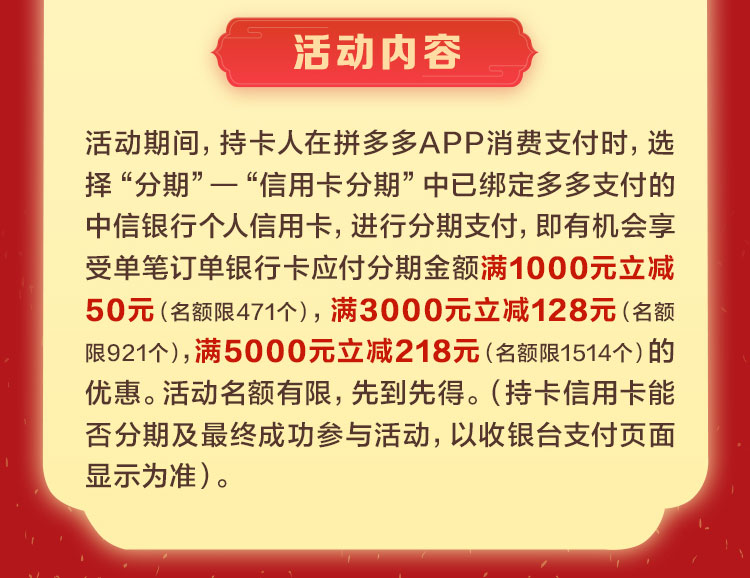 活动期间,持卡人在拼多多APP消费支付时,选择“分期”—“信用卡分期”中已绑定多多支付的中信银行个人信用卡,进行分期支付,即有机会享受单笔订单银行卡应付分期金额满1000元立减50元(名额限471个),满3000元立减128元(名额限921个),满5000元立减218元(名额限1514个)的优惠。活动每日名额有限,先到先得,名额用完后活动将自动结束不另行通知。符合同一身份证号视为同一持卡人,同一持卡人活动期间最多享受三档分期满减优惠各一次,且三档分期满减优惠不可叠加使用(持卡信用卡能否分期及最终成功参与活动,以收银台支付页面显示为准)。
