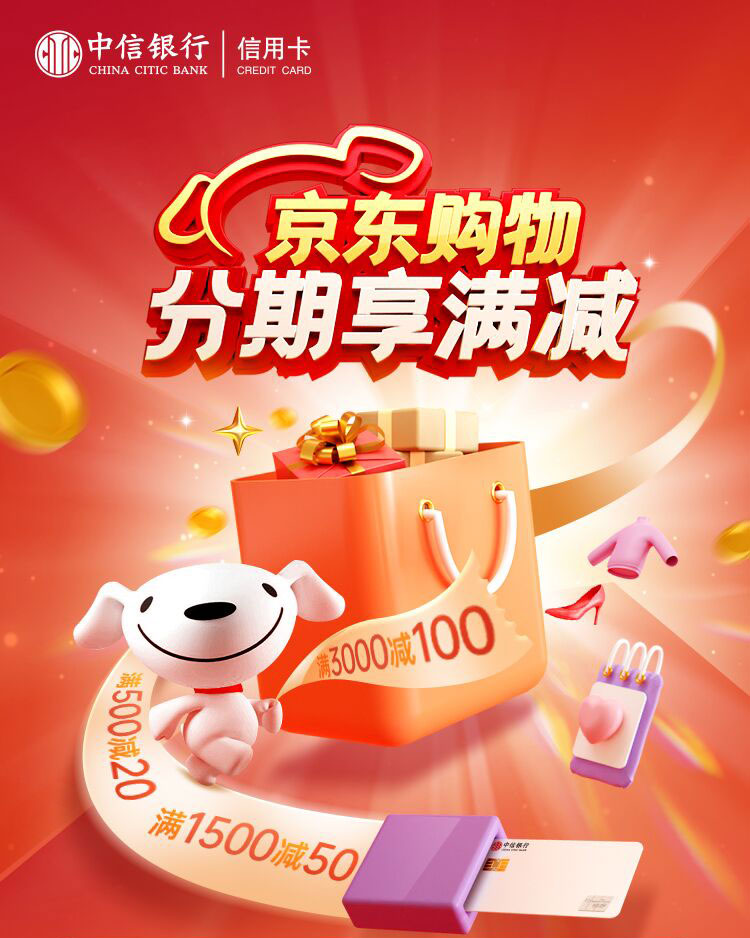 活动期间,持卡人在京东商城购买实物类商品,选择京东支付中信银行信用卡完成在线分期支付,分期金额满500减20元(限3、6、12、24期),限量434个名额;满1500减50元(限3、6、12、24期),限量1023个名额;满3000减100元(限3、6、12、24期),限量1023 个名额;同一持卡人在活动期间每档活动限各享1次优惠。优惠名额有限,先到先得,用完即止。