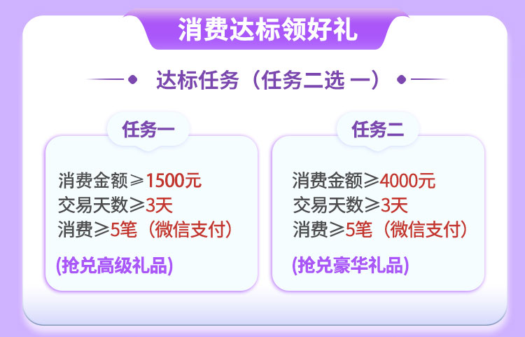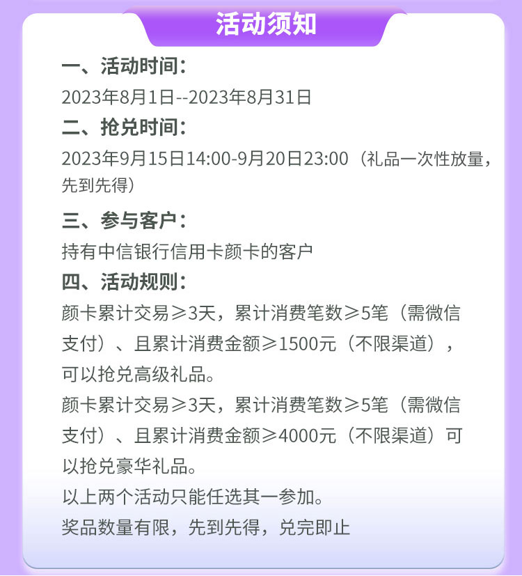 客户在8月1日-8月31日期间,使用颜卡累计交易≥3天、累计消费笔数≥5笔(需微信支付)、且累计消费金额≥4000元(不限渠道),则计为该客户8月豪华达标,达标用户可使用1积分在2023年9月15日14:00-9月20日23:00抢兑一件豪华礼品。