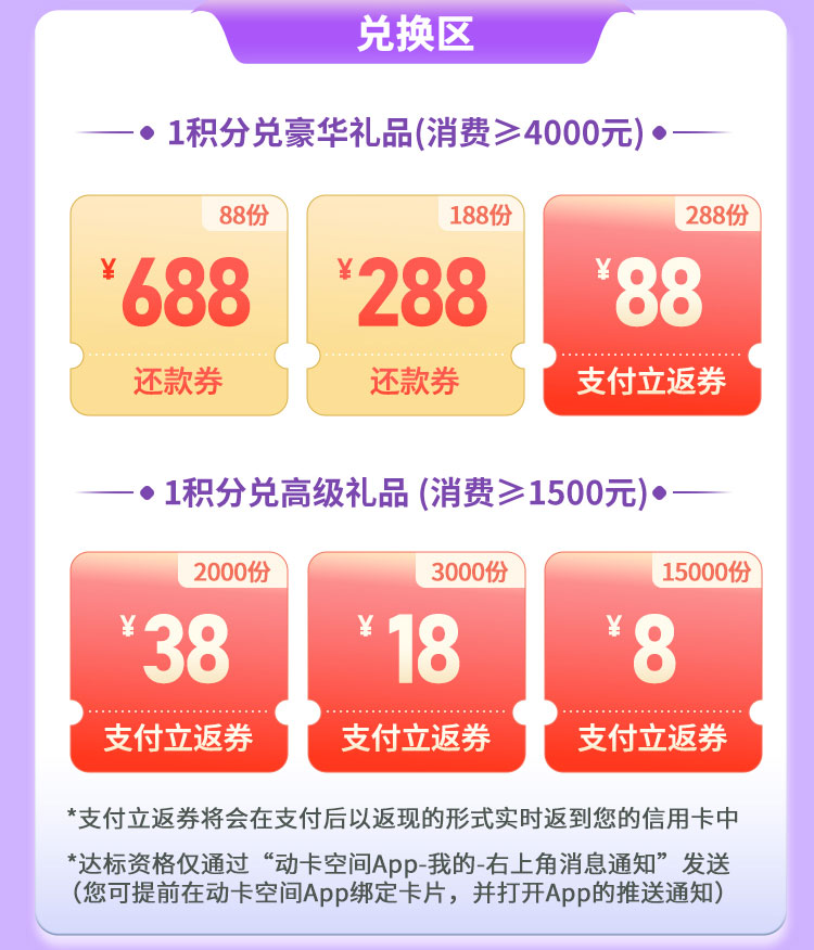 (4) 消费达标的用户可在指定页面通过支付1积分进行礼品抢兑,您需在活动次月20日23:00(含)之前进行礼品抢兑,逾期无法领取,不予补发。
