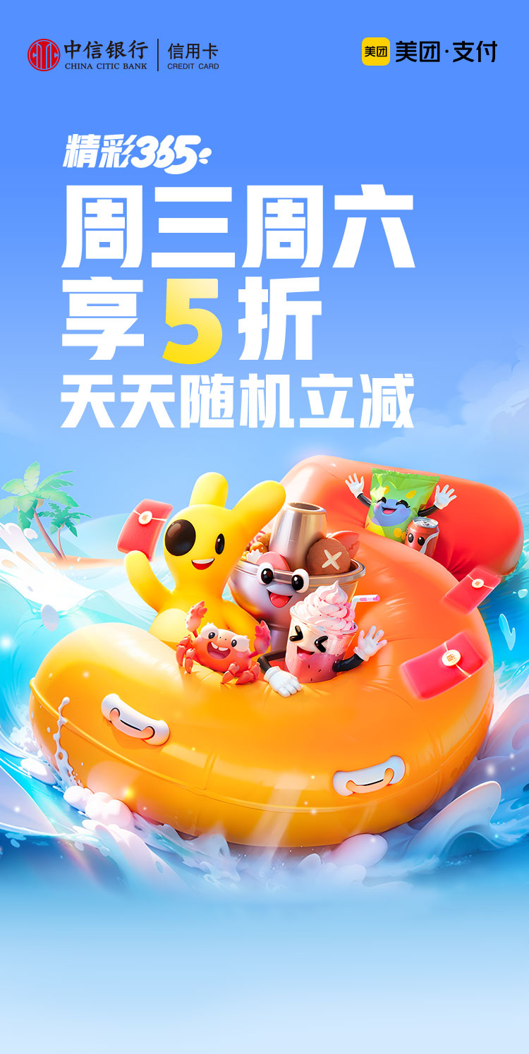 活动期间,每日11:00起,中信银行信用卡持卡人于美团APP-美食团购/大众点评APP指定商户使用美团支付已绑定的中信银行信用卡消费,周三、周六有机会享满50元减25元优惠,活动期间每客户每自然月限享1次;更有天天满50元随机立减最高10元优惠,活动期间同一客户每日限参与1次优惠,每客户每自然月限享2次。