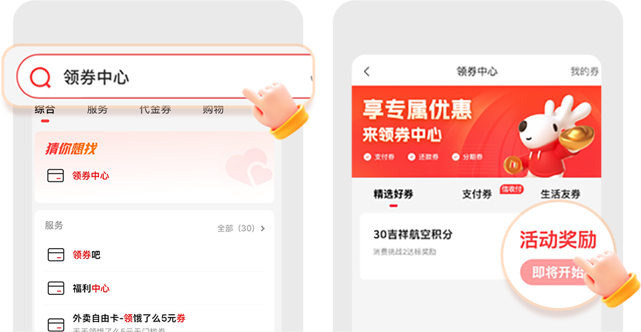 ●领取:在限定领取时间内,客户可通过动卡空间APP(11.0版本以上)——首页——搜索“领券中心”并点击进入”中进行领取。领取成功后的次月底前可收到相应奖励入账至联名卡对应会员账户内。