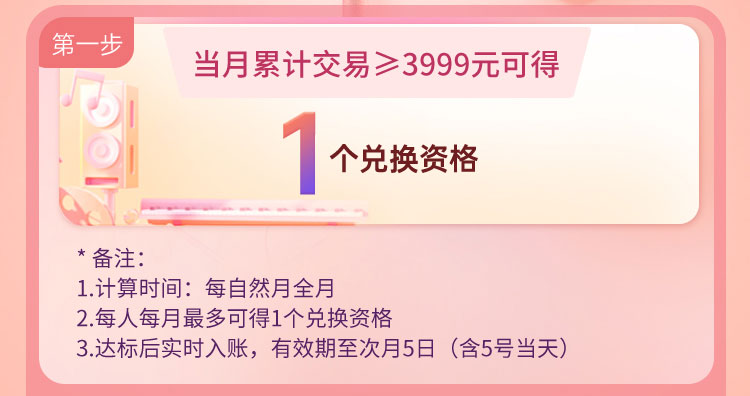 1.活动期间,每自然月累计交易≥3999元,可获得1个【兑换资格】