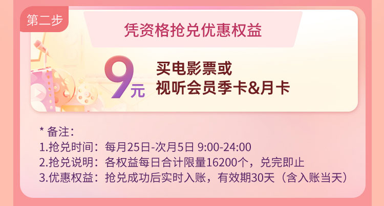 2.每月25日-次月5日 09:00-24:00,凭有效期内的【兑换资格】可参与优惠权益抢兑,凭成功抢兑且在有效期内的【优惠权益】可享9元购电影票/视听VIP优惠。