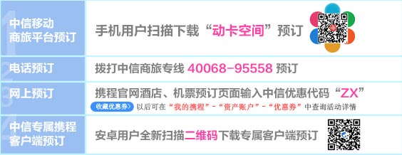 4)中信移动商旅平台为中信信用卡APP客户端“动卡空间”下“商旅预订”的“国内国际机票”及“国内国际酒店”模块;携程专享客户端必须由安卓手机扫描专享二维码下载。