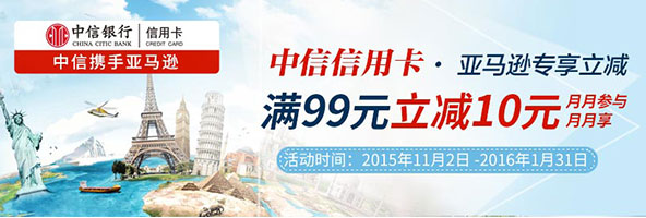 2015年11月2日- 2016年1月31日,中信银行信用卡全场自营商品满99立减10(可与亚马逊其他优惠叠加),月月参与月月享