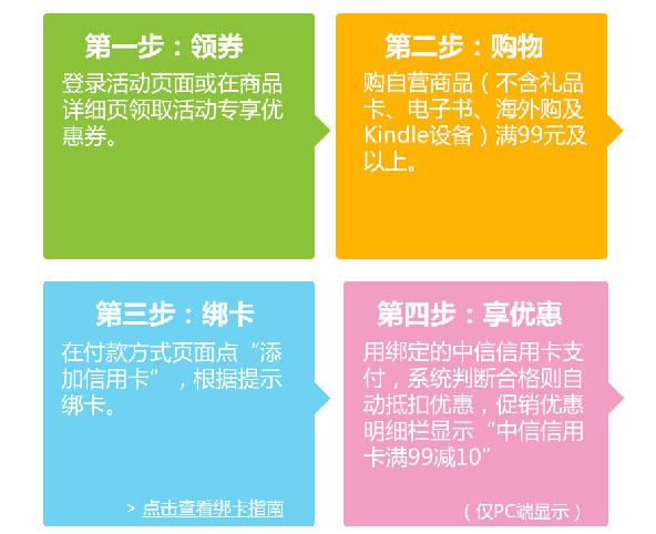 先领取本次活动优惠券,选购亚马逊自营商品(除礼品卡、电子书、海外购及Kindle设备),结算时在付款方式页点击“添加信用卡”绑定或选择已有中信银行信用卡(需带银联标识)支付,满99元立减10元(每月限2万份)。优惠不可累加,数量有限,先下单先得,每卡、每帐户、每月限享一次优惠,额满即止,未使用优惠券自动失效。